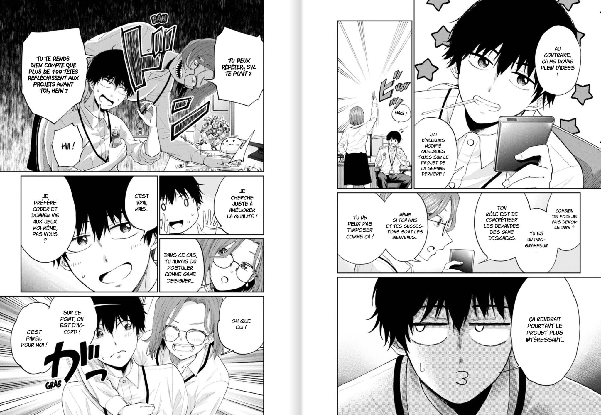 Et puis, mine de rien, ça fait plaisir de voir une femme mise en avant dans un univers souvent très (trop ?) masculin. Alors oui, le duo fille/garçon peut sembler un peu facile sur le papier, mais ça a aussi le mérite de rappeler une chose qu’on oublie encore trop souvent : le jeu vidéo et le développement ne sont pas réservés qu’aux mecs. Haruka apporte une vraie énergie au récit, sans être réduite à un simple rôle secondaire et ça participe clairement à l’équilibre du manga.