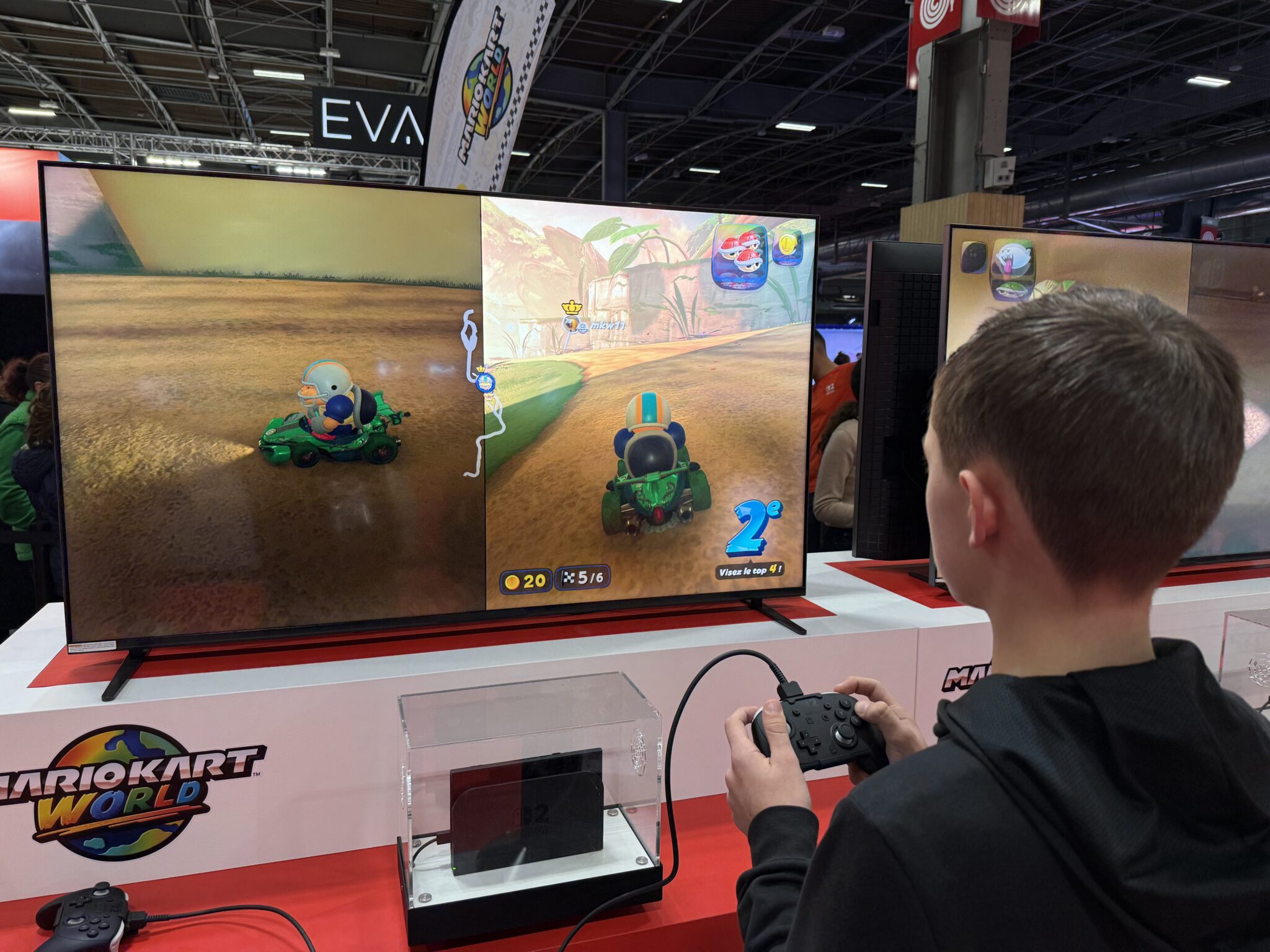 Lui, ce n’était pas sa première édition, mais pourtant il n’a rien vu de tout ça. Pour lui, le salon était une fête. Il a tout voulu essayer, tout voulu voir. Les stands Nintendo, les écrans géants, les points photo, l’arène EVA Kart VR, les goodies (très peu par rapport à l’année précédente), les bornes indé… Il a également découvert des petits jeux qu’il n’aurait sans doute jamais testés ailleurs et a pu mettre la main sur des titres qu’il attendait depuis des mois. Il s’arrêtait à chaque cosplay, prenait en mains les accessoires exposés et observait longuement les streamers et gamers que l’on suit sur YouTube. Il n’a vu ni les absents, ni les espaces réduits, ni la communication trop lisse : il a juste vu de la magie, du partage et des étoiles plein les yeux.
